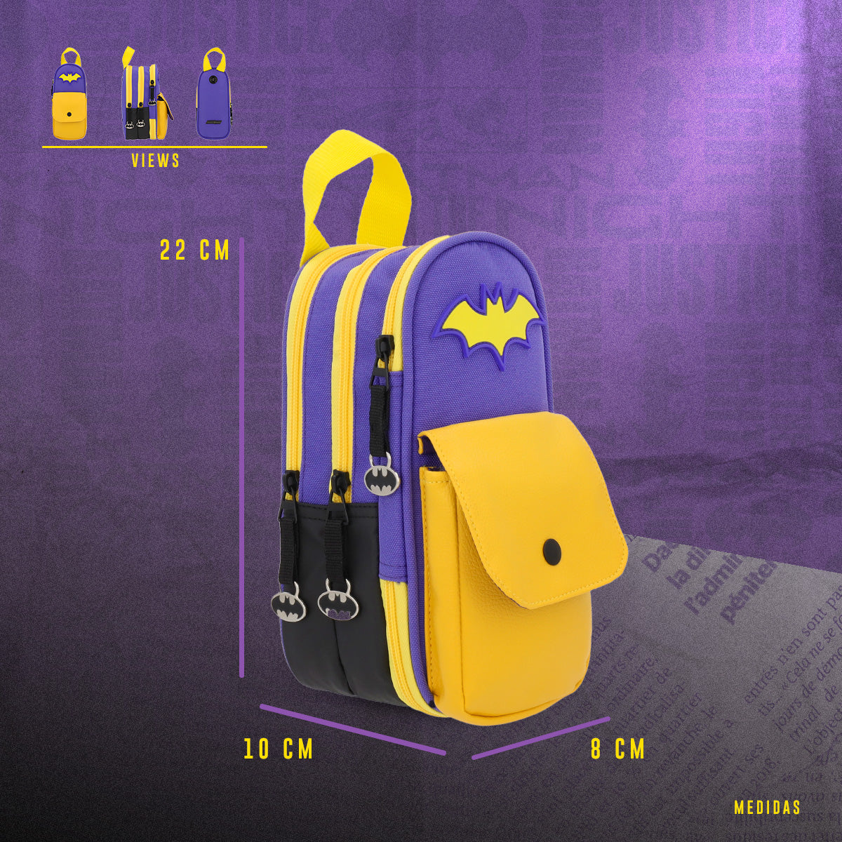 La Estuchera Bat Girl Triple Cierre es perfecta para mantener tus útiles escolares organizados. Los tres compartimentos con cierre metálico te permiten guardar tus lápices, bolígrafos y demás en un solo lugar. Además, cuenta con una bolsa delantera con botón de presión y un parche de goma del logo de Batgirl. Cómoda de llevar gracias a su asa resistente. ¡Ideal para los fans de esta heroína!